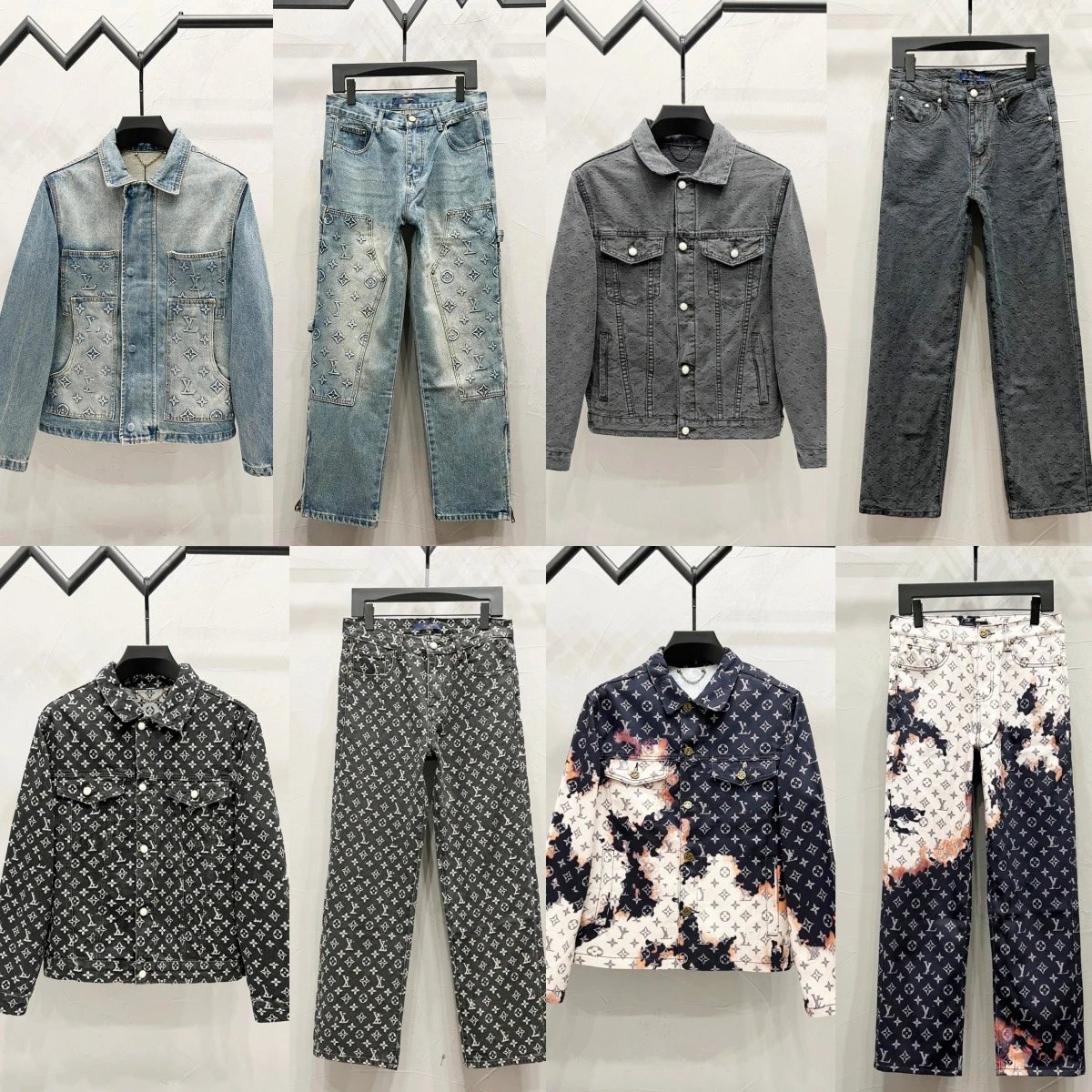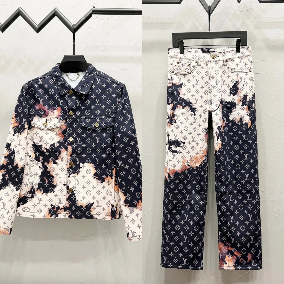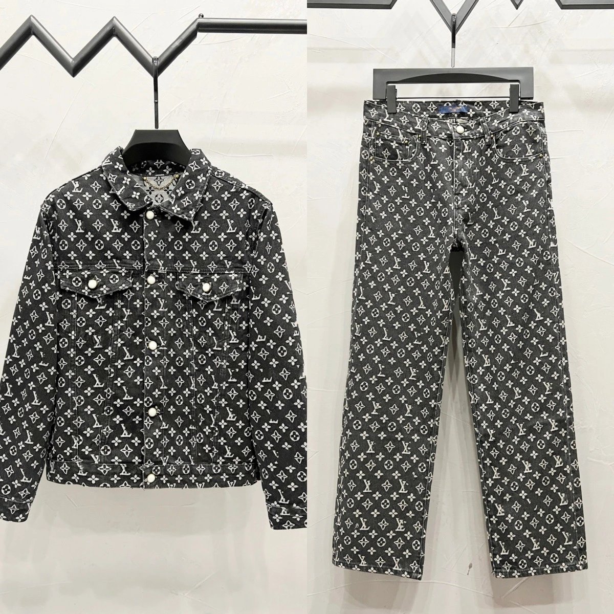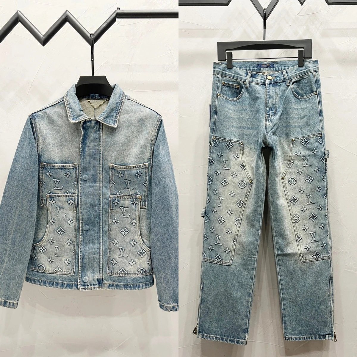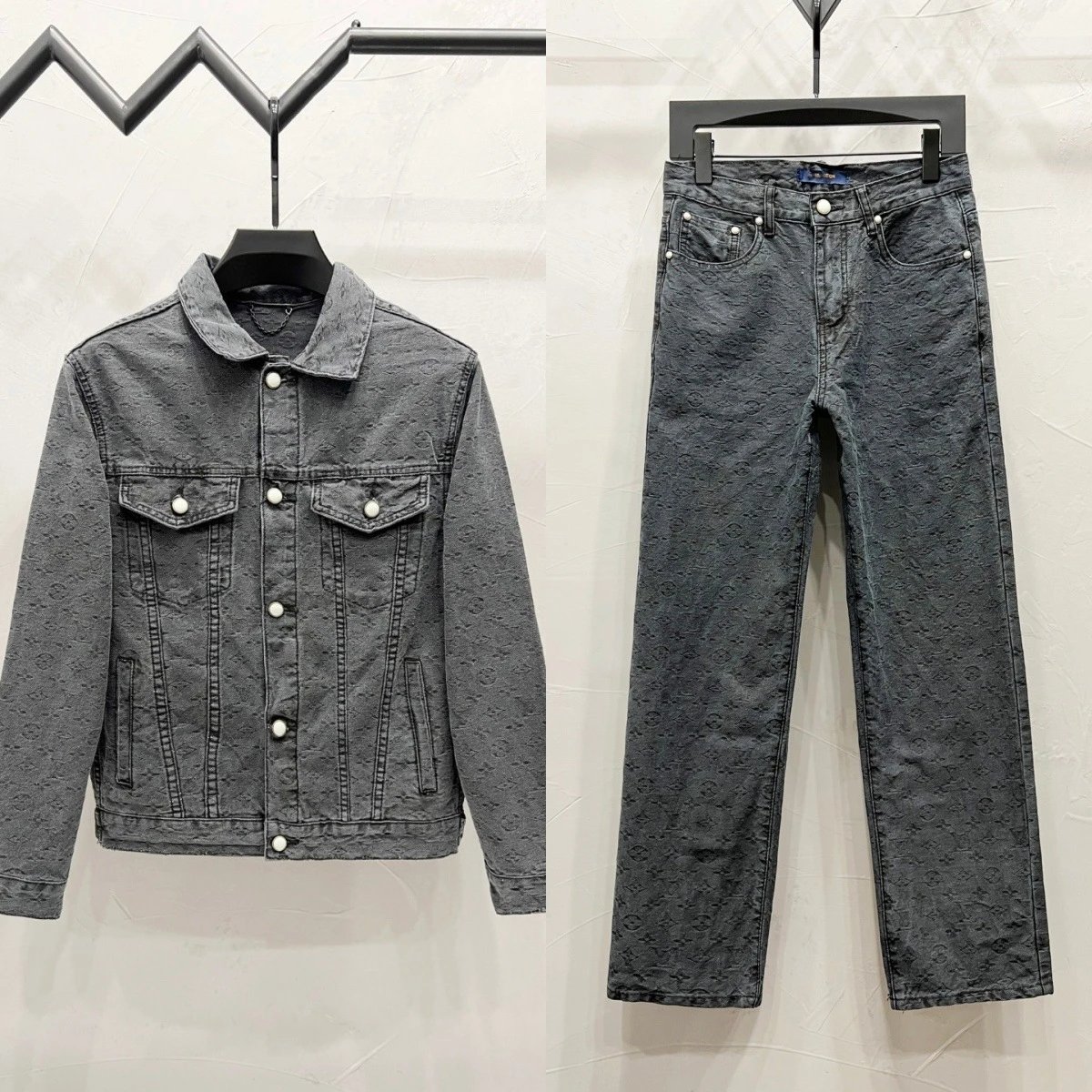 欧美潮牌2025秋季新款满身字母logo提花压花牛仔外套套装裤子